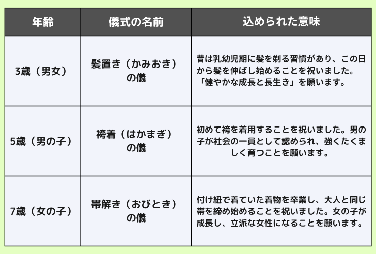 もともと3つの儀式(3歳の「髪置の儀」、5歳の「袴着の儀」、7歳の「帯解の儀」)があり、時代が経つにつれて、3歳は男女共通、5歳は男の子、7歳は女の子の儀式として定着しました。