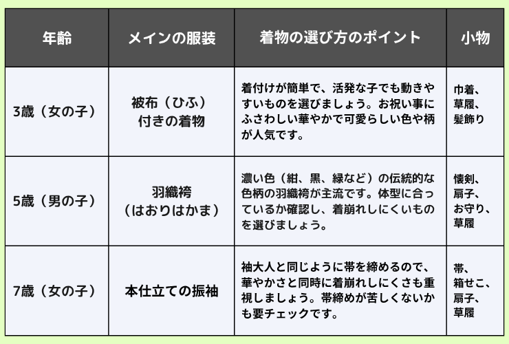 年齢ごとの衣装の意味や必要な小物を把握しておきましょう。