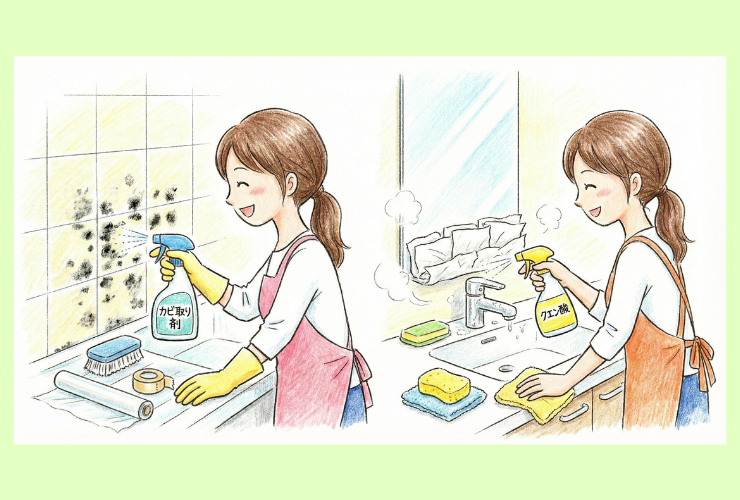 お風呂は「カビ(アルカリ性汚れ)」と「水垢(酸性汚れ)」という性質の違う汚れが混在しています。それぞれの性質に合わせて洗剤を使い分けるのがプロのコツです。
